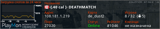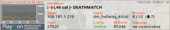 -[.40 cal ]- DEATHMATCH представлен в виде сервера кс 1.6. Из всех имеющихся на сайте модификаций игровых серверов, наша система поставила метку DeathMatch сервера cs. В нашем мониторинге игровых серверов вы так же можете найти быструю навигацию по всем меткам - используйте главную страницу игры Counter Strike 1.6.
