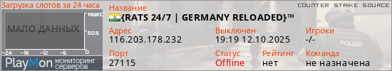 {RATS 24/7 | GERMANY RELOADED}™ представлен в виде сервера ксс. Из всех имеющихся на сайте модификаций игровых серверов, вам может понравиться DeathRun серверы css. А для быстрой навигации по всем меткам - используйте главную страницу игры Counter Strike Source.