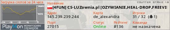 [4FUN] CS-LUZownia.pl [OZYWIANIE,HEAL-DROP,FREEVIP/MISJE/SKINY/ WLASNY PREFIX / RANGI / ASYSTY] представлен в виде сервера кс 1.6. Из всех имеющихся на сайте модификаций игровых серверов, вам может понравиться GunGame серверы cs. А для быстрой навигации по всем меткам - используйте главную страницу игры Counter Strike 1.6.