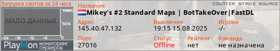Mikey's #2 Standard Maps | BotTakeOver|FastDL представлен в виде сервера ксс. Из всех имеющихся на сайте модификаций игровых серверов, вам может понравиться DeathMatch серверы css. А для быстрой навигации по всем меткам - используйте главную страницу игры Counter Strike Source.