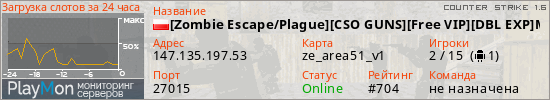 [Zombie Escape/Plague][CSO GUNS][Free VIP][DBL EXP]MULTI-HEAD.PL @ 1shot1kill.pl представлен в виде сервера кс 1.6. Из всех имеющихся на сайте модификаций игровых серверов, наша система поставила метку Zombie сервера cs. В нашем мониторинге игровых серверов вы так же можете найти быструю навигацию по всем меткам - используйте главную страницу игры Counter Strike 1.6.