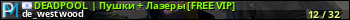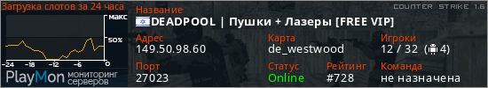 DEADPOOL | Пушки + Лазеры [FREE VIP] представлен в виде сервера кс 1.6. Из всех имеющихся на сайте модификаций игровых серверов, наша система поставила метку Пушки + Лазеры сервера cs. В нашем мониторинге игровых серверов вы так же можете найти быструю навигацию по всем меткам - используйте главную страницу игры Counter Strike 1.6.