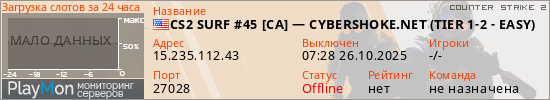 CS2 SURF #45 [CA] — CYBERSHOKE.NET (TIER 1-2 - EASY) представлен в виде сервера кс 2. Из всех имеющихся на сайте модификаций игровых серверов, вам может понравиться Retake серверы cs2. А для быстрой навигации по всем меткам - используйте главную страницу игры Counter Strike 2.
