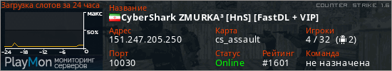 CyberShark ZMURKA³ [HnS] [FastDL + VIP] представлен в виде сервера кс 1.6. Из всех имеющихся на сайте модификаций игровых серверов, наша система поставила метку Hide'n'Seek сервера cs. В нашем мониторинге игровых серверов вы так же можете найти быструю навигацию по всем меткам - используйте главную страницу игры Counter Strike 1.6.