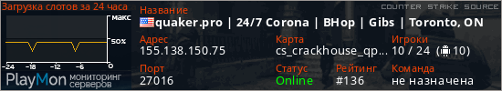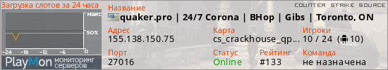 quaker.pro | 24/7 Corona | BHop | Gibs | Toronto, ON представлен в виде сервера ксс. Из всех имеющихся на сайте модификаций игровых серверов, вам может понравиться Zombie серверы css. А для быстрой навигации по всем меткам - используйте главную страницу игры Counter Strike Source.