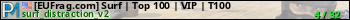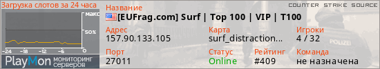 [EUFrag.com] Surf | Top 100 | VIP | T100 представлен в виде сервера ксс. Из всех имеющихся на сайте модификаций игровых серверов, наша система поставила метку Surf сервера css. В нашем мониторинге игровых серверов вы так же можете найти быструю навигацию по всем меткам - используйте главную страницу игры Counter Strike Source.