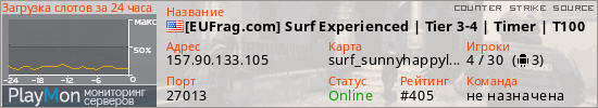 [EUFrag.com] Surf Experienced | Tier 3-4 | Timer | T100 представлен в виде сервера ксс. Из всех имеющихся на сайте модификаций игровых серверов, наша система поставила метку Surf сервера css. В нашем мониторинге игровых серверов вы так же можете найти быструю навигацию по всем меткам - используйте главную страницу игры Counter Strike Source.