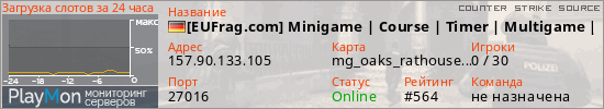 [EUFrag.com] Minigame | Course | Timer | Multigame | Store представлен в виде сервера ксс. Из всех имеющихся на сайте модификаций игровых серверов, наша система поставила метку MiniGame сервера css. В нашем мониторинге игровых серверов вы так же можете найти быструю навигацию по всем меткам - используйте главную страницу игры Counter Strike Source.