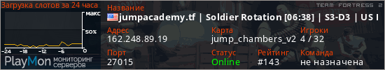 jumpacademy.tf | Soldier Rotation [10:38] | S3-D3 | US East представлен в виде сервера тф2. Из всех имеющихся на сайте модификаций игровых серверов, наша система поставила метку Jump сервера tf2. В нашем мониторинге игровых серверов вы так же можете найти быструю навигацию по всем меткам - используйте главную страницу игры Team Fortress 2.