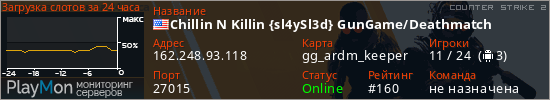 Chillin N Killin {sl4ySl3d} GunGame/Deathmatch представлен в виде сервера кс 2. Из всех имеющихся на сайте модификаций игровых серверов, наша система поставила метку GunGame сервера cs2. В нашем мониторинге игровых серверов вы так же можете найти где поиграть на DeathMatch сервере кс 2.