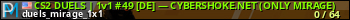 CS2 DUELS | 1v1 #49 [DE] — CYBERSHOKE.NET (ONLY MIRAGE) представлен в виде сервера кс 2. Из всех имеющихся на сайте модификаций игровых серверов, наша система поставила метку 1vs1 сервера cs2. В нашем мониторинге игровых серверов вы так же можете найти быструю навигацию по всем меткам - используйте главную страницу игры Counter Strike 2.