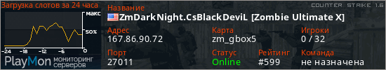 ZmDarkNight.CsBlackDeviL [Zombie Ultimate X] представлен в виде сервера кс 1.6. Из всех имеющихся на сайте модификаций игровых серверов, наша система поставила метку Zombie сервера cs. В нашем мониторинге игровых серверов вы так же можете найти быструю навигацию по всем меткам - используйте главную страницу игры Counter Strike 1.6.