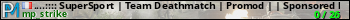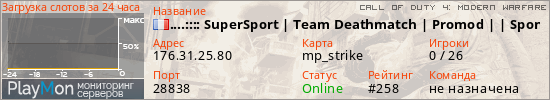 ....:::: SuperSport | Team Deathmatch | Promod | | Sponsored by www.iceops.co ::::.... представлен в виде сервера код 4. Из всех имеющихся на сайте модификаций игровых серверов, наша система поставила метку Deathmatch сервера cod4. В нашем мониторинге игровых серверов вы так же можете найти быструю навигацию по всем меткам - используйте главную страницу игры Call of Duty 4: Modern Warfare.