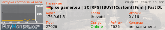 pixelgamer.eu | SC [RPG] [BUY] [Custom] [Fun] | Fast DL представлен в виде сервера ксс. Из всех имеющихся на сайте модификаций игровых серверов, наша система поставила метку RPG сервера css. В нашем мониторинге игровых серверов вы так же можете найти быструю навигацию по всем меткам - используйте главную страницу игры Counter Strike Source.