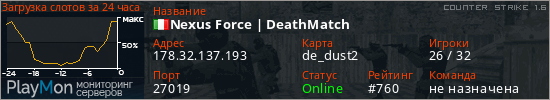 Nexus Force | DeathMatch представлен в виде сервера кс 1.6. Из всех имеющихся на сайте модификаций игровых серверов, наша система поставила метку DeathMatch сервера cs. В нашем мониторинге игровых серверов вы так же можете найти быструю навигацию по всем меткам - используйте главную страницу игры Counter Strike 1.6.