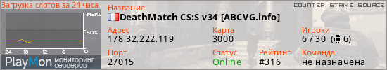 DeathMatch CS:S v34 [ABCVG.info] представлен в виде сервера ксс. Из всех имеющихся на сайте модификаций игровых серверов, наша система поставила метку DeathMatch сервера css. В нашем мониторинге игровых серверов вы так же можете найти быструю навигацию по всем меткам - используйте главную страницу игры Counter Strike Source.