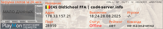 C4S OldSchool FFA | cod4-server.info представлен в виде сервера код 4. Из всех имеющихся на сайте модификаций игровых серверов, вам может понравиться HighXP серверы cod4. А для быстрой навигации по всем меткам - используйте главную страницу игры Call of Duty 4: Modern Warfare.