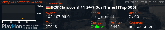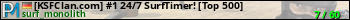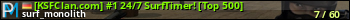 [KSFClan.com] #1 24/7 SurfTimer! [Top 500] представлен в виде сервера ксс. Из всех имеющихся на сайте модификаций игровых серверов, наша система поставила метку Surf сервера css. В нашем мониторинге игровых серверов вы так же можете найти быструю навигацию по всем меткам - используйте главную страницу игры Counter Strike Source.