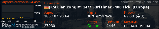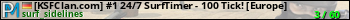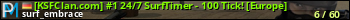 [KSFClan.com] #1 24/7 SurfTimer - 100 Tick! [Europe] представлен в виде сервера ксс. Из всех имеющихся на сайте модификаций игровых серверов, наша система поставила метку Surf сервера css. В нашем мониторинге игровых серверов вы так же можете найти быструю навигацию по всем меткам - используйте главную страницу игры Counter Strike Source.