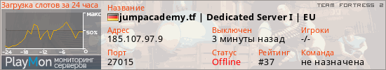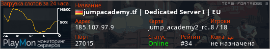 jumpacademy.tf | Dedicated Server I | EU представлен в виде сервера тф2. Из всех имеющихся на сайте модификаций игровых серверов, наша система поставила метку Jump сервера tf2. В нашем мониторинге игровых серверов вы так же можете найти быструю навигацию по всем меткам - используйте главную страницу игры Team Fortress 2.