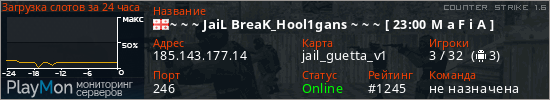 ~ ~ ~ JaiL BreaK_Hool1gans ~ ~ ~ [ 23:00 M a F i A ] представлен в виде сервера кс 1.6. Из всех имеющихся на сайте модификаций игровых серверов, наша система поставила метку JailBreak сервера cs. В нашем мониторинге игровых серверов вы так же можете найти быструю навигацию по всем меткам - используйте главную страницу игры Counter Strike 1.6.