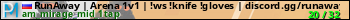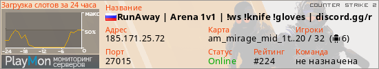 RunAway | Arena 1v1 | !ws !knife !gloves | discord.gg/runaway представлен в виде сервера кс 2. Из всех имеющихся на сайте модификаций игровых серверов, наша система поставила метку 1vs1 сервера cs2. В нашем мониторинге игровых серверов вы так же можете найти быструю навигацию по всем меткам - используйте главную страницу игры Counter Strike 2.