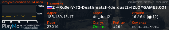 Z -=RuSerV-#2-Deathmatch-(de_dust2)-[ZLOYGAMES.COM]=- представлен в виде сервера ксс. Из всех имеющихся на сайте модификаций игровых серверов, наша система поставила метку DeathMatch сервера css. В нашем мониторинге игровых серверов вы так же можете найти быструю навигацию по всем меткам - используйте главную страницу игры Counter Strike Source.