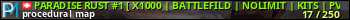 PARADISE RUST #1 [ X1000 | BATTLEFILD | NOLIMIT | KITS | PVP ] представлен в виде сервера раст. Из всех имеющихся на сайте модификаций игровых серверов, вам может понравиться NoDecay серверы rust. А для быстрой навигации по всем меткам - используйте главную страницу игры Rust.
