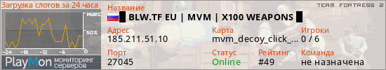█ BLW.TF EU | MVM | X100 WEAPONS █ представлен в виде сервера тф2. Из всех имеющихся на сайте модификаций игровых серверов, вам может понравиться JailBreak серверы tf2. А для быстрой навигации по всем меткам - используйте главную страницу игры Team Fortress 2.