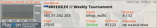 KREEDZ.EE // Weekly Tournament представлен в виде сервера кс 1.6. Из всех имеющихся на сайте модификаций игровых серверов, вам может понравиться Hide'n'Seek серверы cs. А для быстрой навигации по всем меткам - используйте главную страницу игры Counter Strike 1.6.