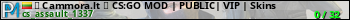 亗 Cammora.lt 亗 CS:GO MOD | PUBLIC| VIP | Skins представлен в виде сервера кс 1.6. Из всех имеющихся на сайте модификаций игровых серверов, вам может понравиться DeathRun серверы cs. А для быстрой навигации по всем меткам - используйте главную страницу игры Counter Strike 1.6.