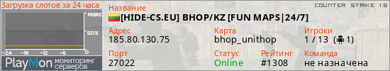 [HIDE-CS.EU] BHOP/KZ [FUN MAPS|24/7] представлен в виде сервера кс 1.6. Из всех имеющихся на сайте модификаций игровых серверов, наша система поставила метку Hide'n'Seek сервера cs. В нашем мониторинге игровых серверов вы так же можете найти быструю навигацию по всем меткам - используйте главную страницу игры Counter Strike 1.6.