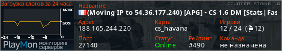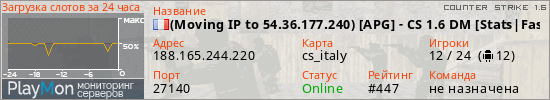 (Moving IP to 54.36.177.240) [APG] - CS 1.6 DM [Stats|FastDL] представлен в виде сервера кс 1.6. Из всех имеющихся на сайте модификаций игровых серверов, наша система поставила метку DeathMatch сервера cs. В нашем мониторинге игровых серверов вы так же можете найти быструю навигацию по всем меткам - используйте главную страницу игры Counter Strike 1.6.
