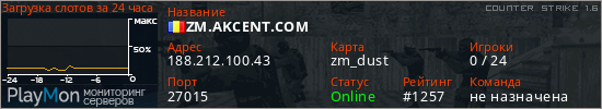 ZM.AKCENT.COM представлен в виде сервера кс 1.6. Из всех имеющихся на сайте модификаций игровых серверов, наша система поставила метку Zombie сервера cs. В нашем мониторинге игровых серверов вы так же можете найти быструю навигацию по всем меткам - используйте главную страницу игры Counter Strike 1.6.