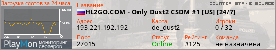 HL2GO.COM - Only Dust2 CSDM #1 [US] [24/7] представлен в виде сервера ксс. Из всех имеющихся на сайте модификаций игровых серверов, наша система поставила метку DeathMatch сервера css. В нашем мониторинге игровых серверов вы так же можете найти быструю навигацию по всем меткам - используйте главную страницу игры Counter Strike Source.