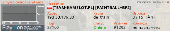 [TEAM-KAMELOT.PL] [PAINTBALL+BF2] представлен в виде сервера кс 1.6. Из всех имеющихся на сайте модификаций игровых серверов, наша система поставила метку PaintBall сервера cs. В нашем мониторинге игровых серверов вы так же можете найти быструю навигацию по всем меткам - используйте главную страницу игры Counter Strike 1.6.