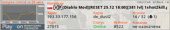 |͇̿V͇̿I͇̿P͇̿ [Diablo Mod][RESET 25.12 18:00][381 lvl] 1shot2kill.pl [Medium EXP][Gildie/Artefakty/Misje] представлен в виде сервера кс 1.6. Из всех имеющихся на сайте модификаций игровых серверов, вам может понравиться DeathRun серверы cs. А для быстрой навигации по всем меткам - используйте главную страницу игры Counter Strike 1.6.