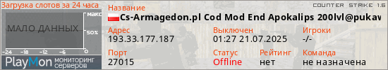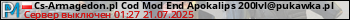 Cs-Armagedon.pl Cod Mod End Apokalips 200lvl@pukawka.pl представлен в виде сервера кс 1.6. Из всех имеющихся на сайте модификаций игровых серверов, вам может понравиться DeathRun серверы cs. А для быстрой навигации по всем меткам - используйте главную страницу игры Counter Strike 1.6.