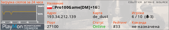 ★Pro100Game[DM]+16★ представлен в виде сервера ксс. Из всех имеющихся на сайте модификаций игровых серверов, наша система поставила метку DeathMatch сервера css. В нашем мониторинге игровых серверов вы так же можете найти быструю навигацию по всем меткам - используйте главную страницу игры Counter Strike Source.