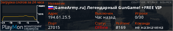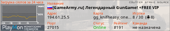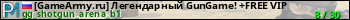 [GameArmy.ru] Легендарный GunGame! +FREE VIP представлен в виде сервера ксс. Из всех имеющихся на сайте модификаций игровых серверов, наша система поставила метку GunGame сервера css. В нашем мониторинге игровых серверов вы так же можете найти быструю навигацию по всем меткам - используйте главную страницу игры Counter Strike Source.