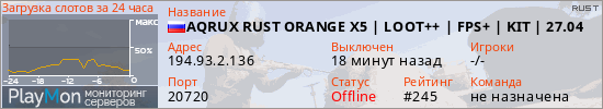 AQRUX RUST ORANGE X5 | LOOT++ | FPS+ | KIT | 27.04 представлен в виде сервера раст. Из всех имеющихся на сайте модификаций игровых серверов, наша система поставила метку Loot сервера rust. В нашем мониторинге игровых серверов вы так же можете найти быструю навигацию по всем меткам - используйте главную страницу игры Rust.