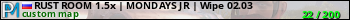 RUST ROOM 1.5x | MONDAYS JR | Wipe 02.03 представлен в виде сервера раст. Из всех имеющихся на сайте модификаций игровых серверов, вам может понравиться NoDecay серверы rust. А для быстрой навигации по всем меткам - используйте главную страницу игры Rust.
