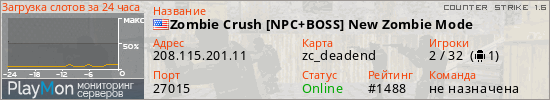 Zombie Crush [NPC+BOSS] New Zombie Mode представлен в виде сервера кс 1.6. Из всех имеющихся на сайте модификаций игровых серверов, наша система поставила метку Zombie сервера cs. В нашем мониторинге игровых серверов вы так же можете найти быструю навигацию по всем меткам - используйте главную страницу игры Counter Strike 1.6.