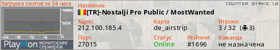 [TR]-Nostalji Pro Public / MostWanted представлен в виде сервера кс 1.6. Из всех имеющихся на сайте модификаций игровых серверов, вам может понравиться GunGame серверы cs. А для быстрой навигации по всем меткам - используйте главную страницу игры Counter Strike 1.6.