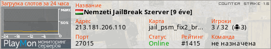 Nemzeti JailBreak Szerver [9 éve] представлен в виде сервера кс 1.6. Из всех имеющихся на сайте модификаций игровых серверов, наша система поставила метку JailBreak сервера cs. В нашем мониторинге игровых серверов вы так же можете найти быструю навигацию по всем меткам - используйте главную страницу игры Counter Strike 1.6.