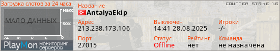 AntalyaEkip представлен в виде сервера кс 1.6. Из всех имеющихся на сайте модификаций игровых серверов, вам может понравиться DeathRun серверы cs. А для быстрой навигации по всем меткам - используйте главную страницу игры Counter Strike 1.6.