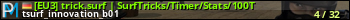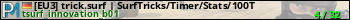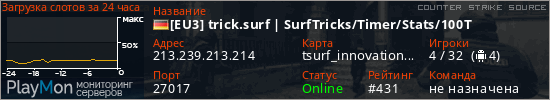 [EU3] trick.surf | SurfTricks/Timer/Stats/100T представлен в виде сервера ксс. Из всех имеющихся на сайте модификаций игровых серверов, наша система поставила метку Surf сервера css. В нашем мониторинге игровых серверов вы так же можете найти быструю навигацию по всем меткам - используйте главную страницу игры Counter Strike Source.