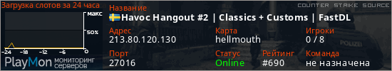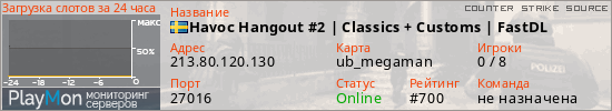 Havoc Hangout #2 | Classics + Customs | FastDL представлен в виде сервера ксс. Из всех имеющихся на сайте модификаций игровых серверов, наша система поставила метку Classic сервера css. В нашем мониторинге игровых серверов вы так же можете найти быструю навигацию по всем меткам - используйте главную страницу игры Counter Strike Source.