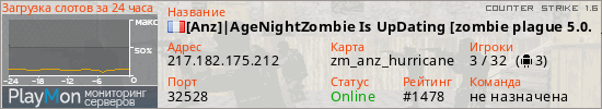 [Anz]|AgeNightZombie Is UpDating [zombie plague 5.0.8] представлен в виде сервера кс 1.6. Из всех имеющихся на сайте модификаций игровых серверов, наша система поставила метку Zombie сервера cs. В нашем мониторинге игровых серверов вы так же можете найти быструю навигацию по всем меткам - используйте главную страницу игры Counter Strike 1.6.