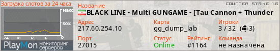 BLACK LINE - Multi GUNGAME - [Tau Cannon + Thunder + ZEUS ] EXGG представлен в виде сервера кс 1.6. Из всех имеющихся на сайте модификаций игровых серверов, наша система поставила метку GunGame сервера cs. В нашем мониторинге игровых серверов вы так же можете найти быструю навигацию по всем меткам - используйте главную страницу игры Counter Strike 1.6.